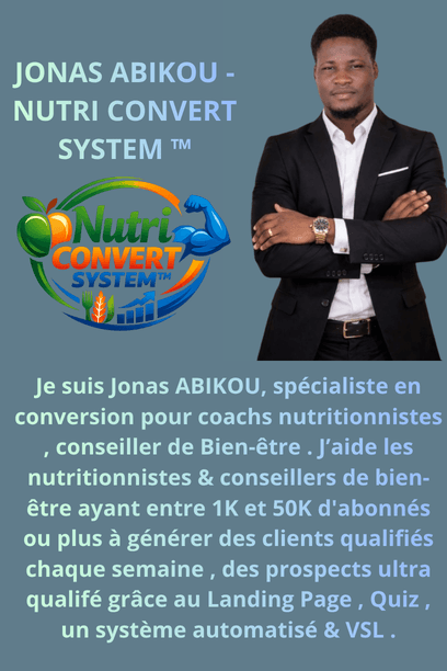 Je suis Jonas ABIKOU, spécialiste en conversion pour coachs nutritionnistes & diététique ,conseiller de Bien-être . J’aide les nutritionnistes & conseillers de bien-être ayant entre 1K et 50K d'abonnés ou plus à générer des clients qualifiés chaque semaine , des prospects ultra qualifé grâce au Landing Page , Quiz , un système automatisé & VSL .